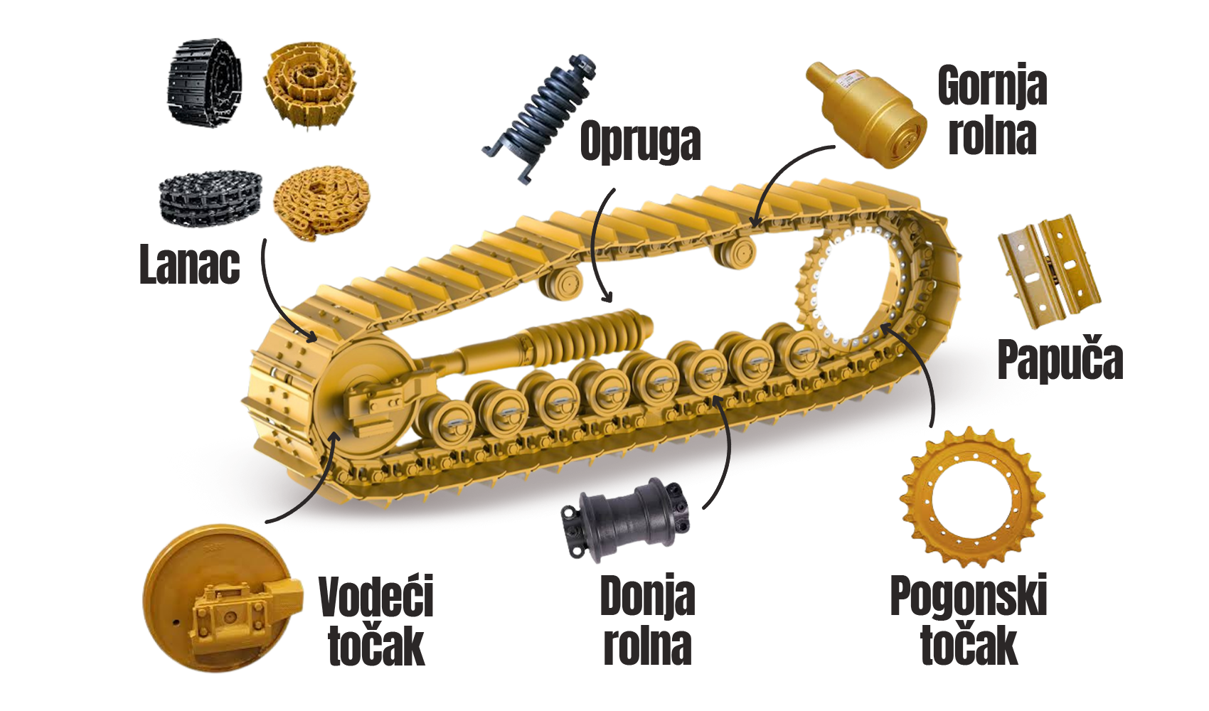 Nudimo kompletan asortiman dijelova gusjeničnih sistema za građevinske i industrijske mašine – uključujući lanac, vodeće i pogonske točkove, opruge, donje i gornje rolne te papuče. Naši proizvodi dolaze od provjerenih proizvođača, spremni za rad u najtežim uslovima i odmah dostupni za isporuku. Kvalitetna izrada i širok izbor dimenzija garantiraju pouzdanost i dugotrajnost u svakodnevnim radovima.